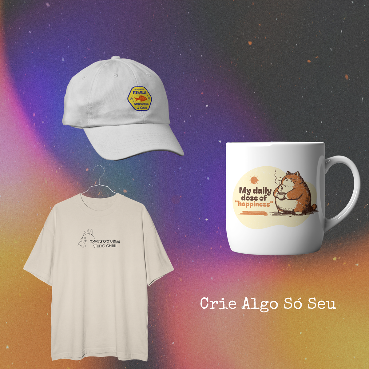 Camisetas, bonés, canecas e muito mais — do seu jeito, com a sua identidade.